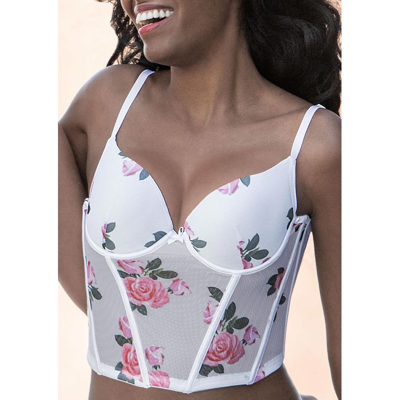 This corset combines charm and comfort with its lace construction and preformed cup with flexible underwires. Featuring a charming floral print, it adds a touch of femininity and style to your underwear collection. In an elegant white color, this corset is perfect for enhancing your figure with a touch of charm and sophistication. Ideal for wearing under your favorite garments or as a seductive piece of lingerie.
